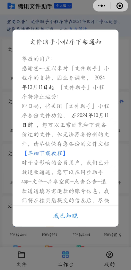 【大河财立方消息】8月5日,根据腾讯文件助手公告,因业务调整,2024年10月11日起“文件助手”小程序将停止运营;即日起,将关闭“文件助手”小程序备份文件功能,在2024年10月11日前,用户可以正常浏览和下载备份过的文件,但无法再备份新的文件。对于受影响的会员用户,退款通道已开放。