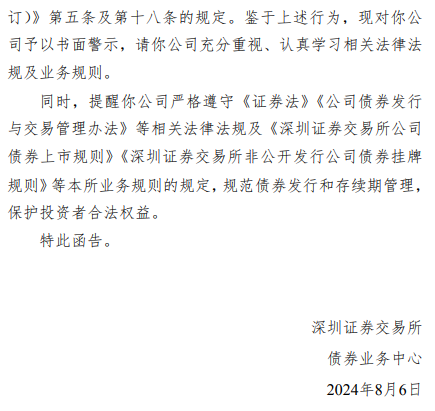 深交所称,上述行为违反了《深圳证券交易所非公开发行公司债券业务管理暂行办法》第七条及第十六条、《深圳证券交易所公司债券上市规则(2022年修订)》第1.5条及第3.1.1条、《深圳证券交易所非公开发行公司债券挂牌规则(2022年修订)》第五条及第十八条的规定。鉴于上述行为,现对泰禾集团予以书面警示。