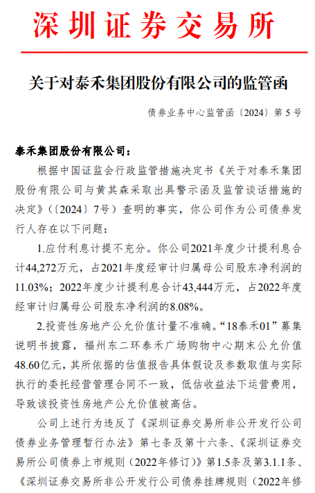 【大河财立方消息】8月6日,深交所对泰禾集团发出监管函。