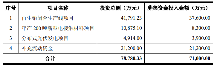 募集资金拟用于再生铅闭合生产线项目、年产200吨新型电接触材料项目、分布式光伏发电项目及补充流动资金。