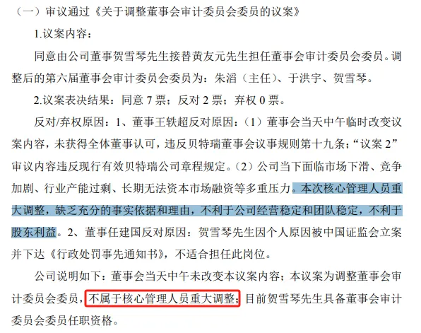 对此,公司作出说明:董事会当天中午未改变本议案内容;本议案为调整董事会审计委员会委员,不属于核心管理人员重大调整;目前贺雪琴先生具备董事会审计委员会委员任职资格。