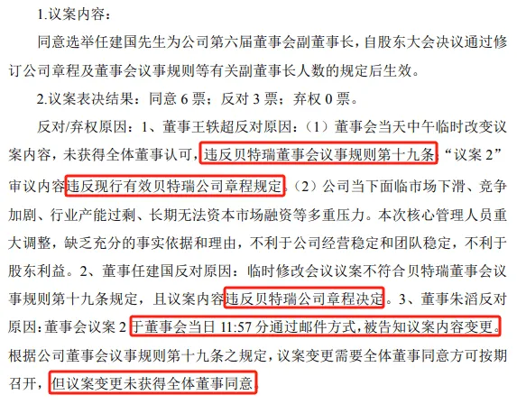 王轶超在反对原因中提到,董事会当天中午临时改变议案内容,未获得全体董事认可,违反贝特瑞董事会议事规则第十九条;“议案2”(即《关于选举任建国为公司副董事长的议案》)审议内容违反现行有效贝特瑞公司章程规定。