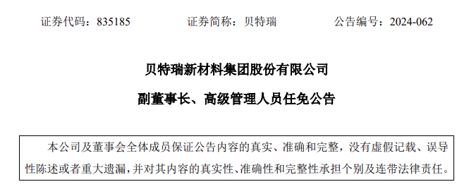 7月31日,贝特瑞发布两则公告,披露了公司副董事长、高级管理人员任免一事。