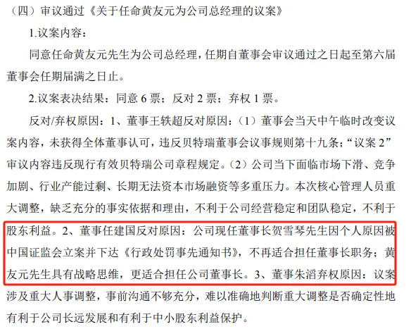 前述《关于选举任建国为公司副董事长的议案》《关于免去任建国总经理职务的议案》《关于任命黄友元为公司总经理的议案》,王轶超、任建国反对的“声浪”更大。