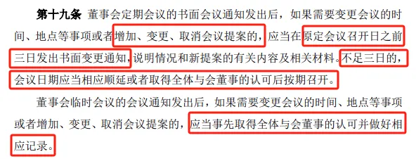 “不足三日的,会议日期应当相应顺延或者取得全体与会董事的认可后按期召开。董事会临时会议的会议通知发出后,如果需要变更会议的时间、地点等事项或者增加、变更、取消会议提案的,应当事先取得全体与会董事的认可并做好相应记录。”