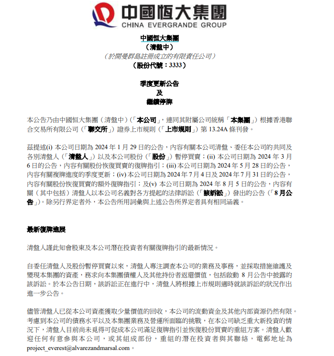 【大河财立方消息】8月9日晚间,中国恒大发布公告称,公司清盘人自委任以来专注于调查公司业务及事务,并采取措施维护及变现集团资产,务求向集团债权人及其他持份者返还价值,包括启动8月公告中披露的该诉讼。