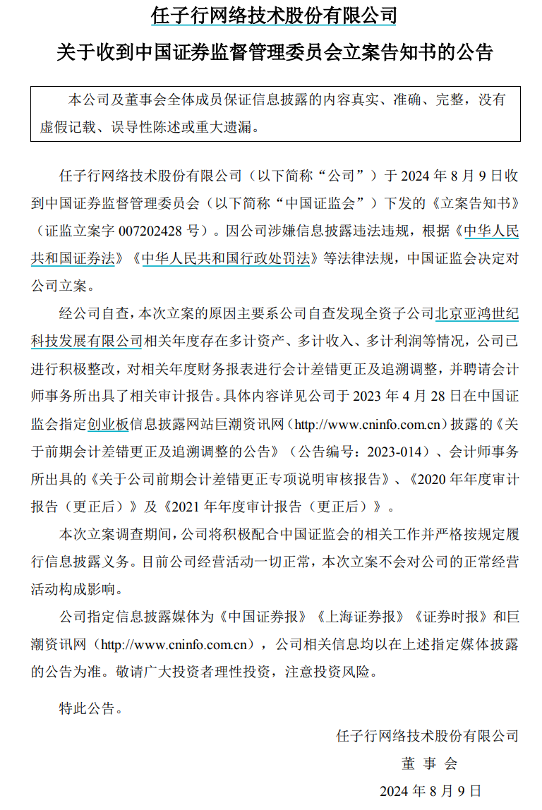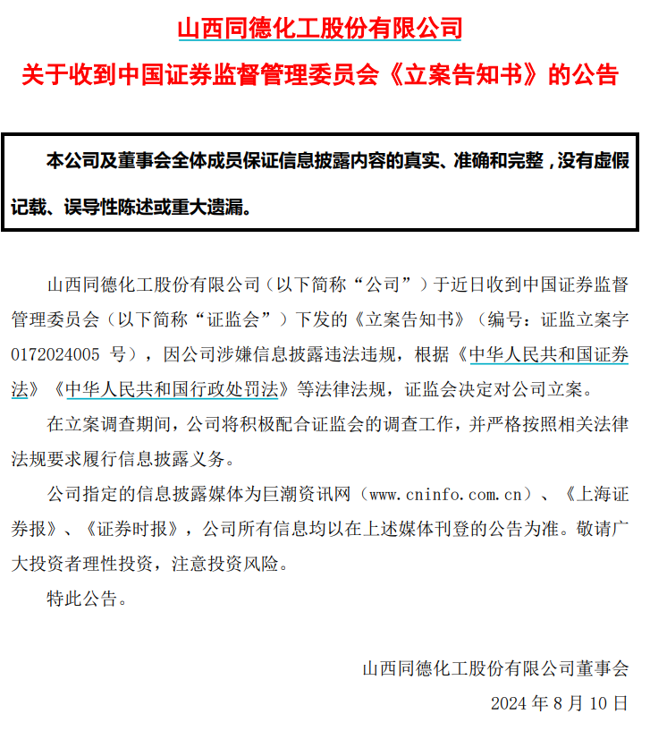 8月9日晚间,同德化工、任子行、中青宝三家上市公司相继公告,被中国证监会立案调查