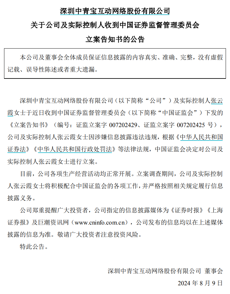 8月9日晚间,同德化工、任子行、中青宝三家上市公司相继公告,被中国证监会立案调查,原因均为涉嫌信息披露违法违规。