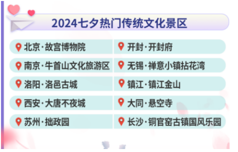 在同程平台上,售价更高的“酒店+晚餐”“酒店+景区”等类型的套餐,预订热度环比增长122%,且更受女性用户欢迎。七夕当天传统文化类景区预订热度环比上涨62%,开封府、洛邑古城等河南景点,入选七夕热门传统文化景区,此外,夜游、演唱会、流星雨等也是游客关注较高的七夕出游主题。