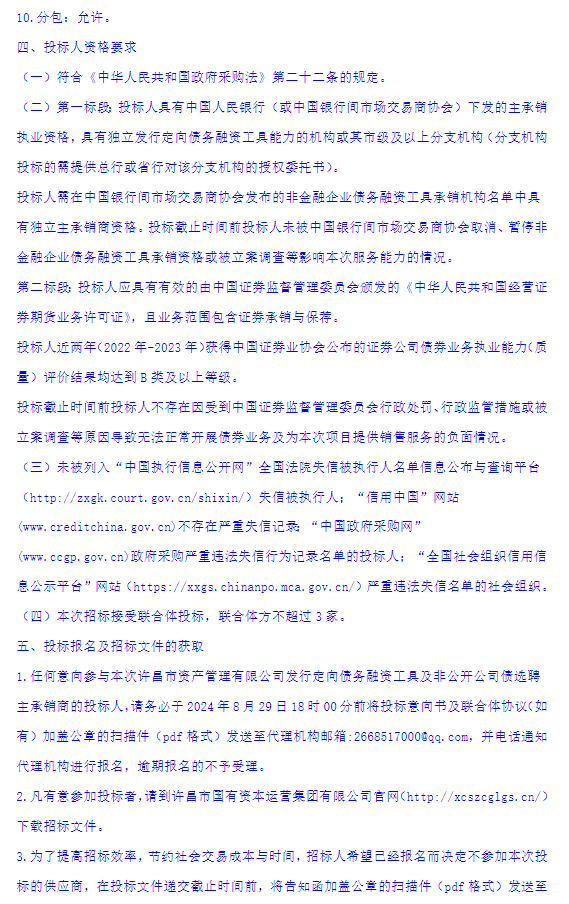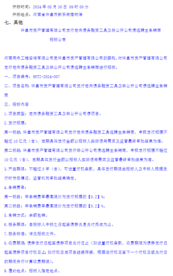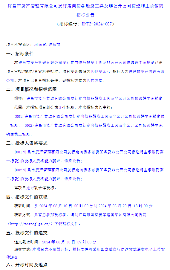 【大河财立方消息】8月12日消息,许昌市资产管理有限公司(以下简称许昌资产)发债项目选聘主承销商。