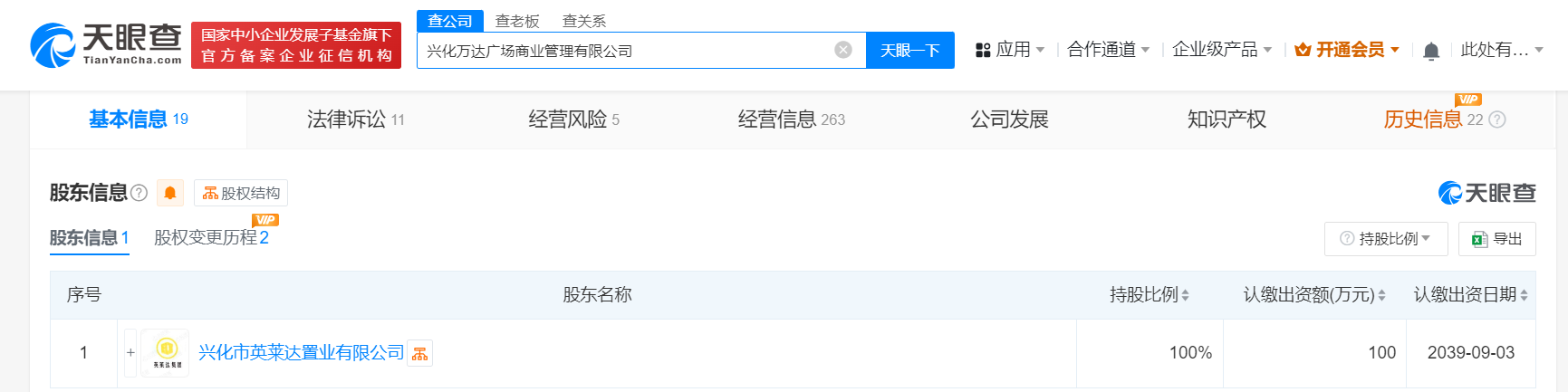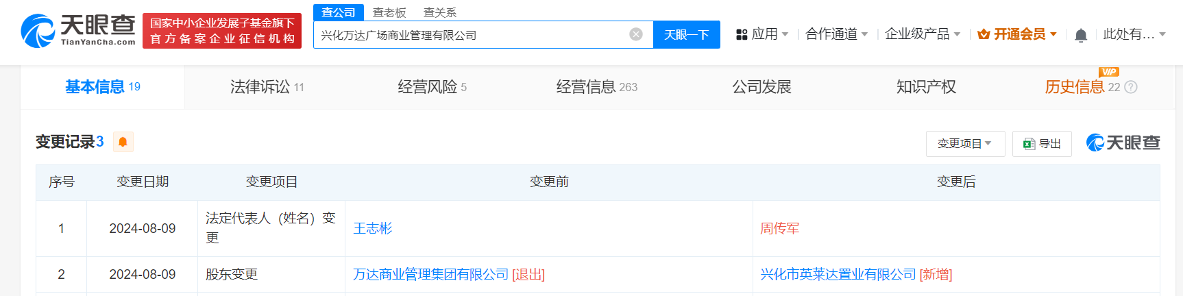 【大河财立方消息】天眼查App显示,近日,兴化万达广场商业管理有限公司发生变更,原全资股东万达商业管理集团有限公司退出,新增兴化市英莱达置业有限公司为股东并全资持股,同时,法定代表人由王志彬变更为周传军。