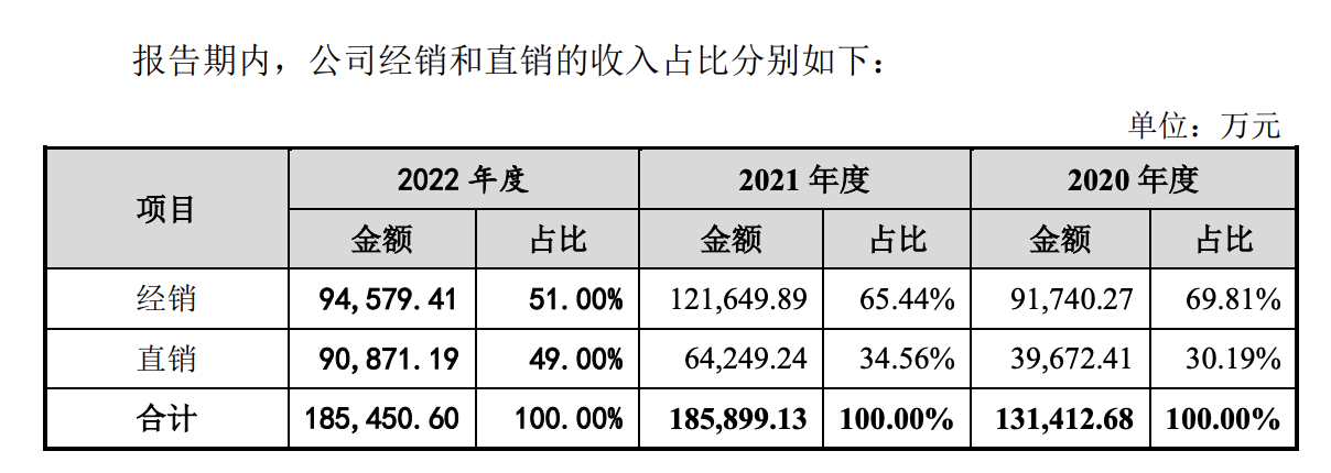 招股书资料显示,2020年至2022年,长晶科技按销售模式的收入情况划分,来自经销的收入分别为9.17亿元、12.16亿元、9.46亿元,占营收比例分别为69.81%、65.44%、51.00%。