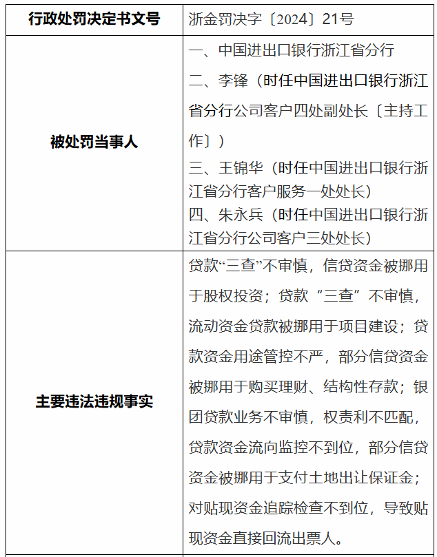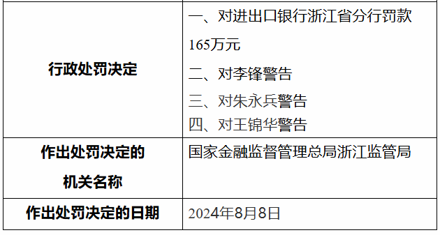 国家金融监督管理总局浙江监管局对时任中国进出口银行浙江省分行公司客户四处副处长李锋、时任中国进出口银行浙江省分行客户服务一处处长王锦华、时任中国进出口银行浙江省分行公司客户三处处长朱永兵分别给予警告。