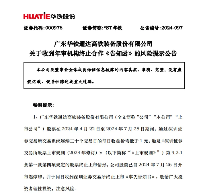 公司8月16日晚披露,公司于近日收到2023年度年审机构北京炎黄会计师事务所(普通合伙)(下称“炎黄所”)的《告知函》。出于对收不到审计款的担忧,炎黄所拟终止与*ST华铁的合作。