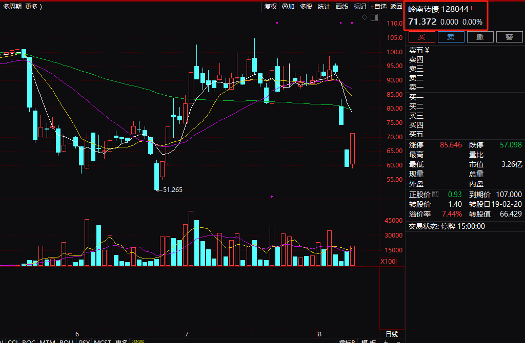 岭南转债8月14日到期,到期时剩余金额为4.56亿元,发行人岭南股份无法按期偿付本息。岭南转债目前已经停止交易、停止转股,到期前的最后收盘价为71.372元。