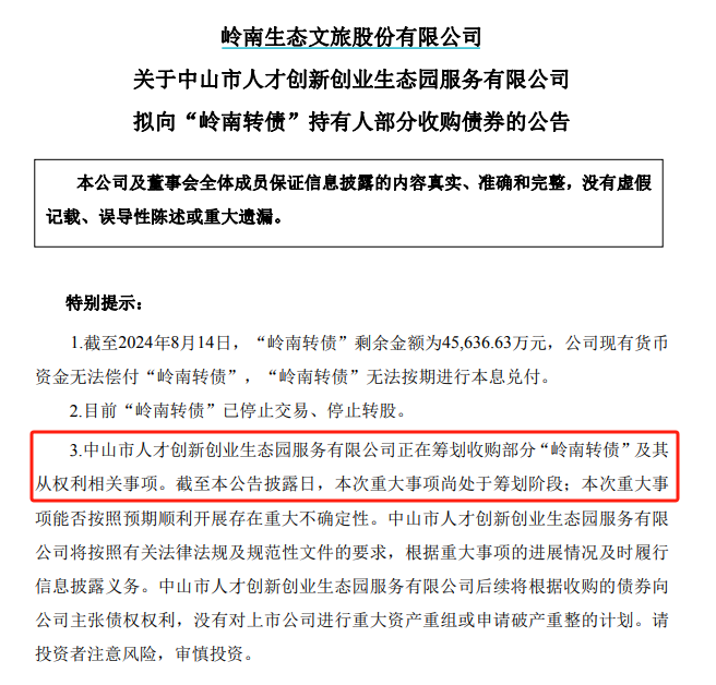 岭南股份表示,中山市人才创新园公司后续将根据收购的债券向公司主张债权权利,没有对上市公司进行重大资产重组或申请破产重整的计划。请投资者注意风险,审慎投资。