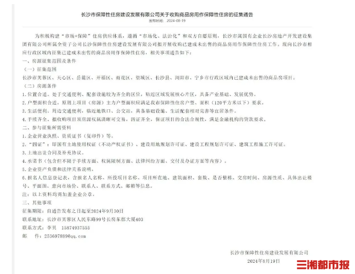 今日(8月19日),长沙市保障性住房建设发展有限公司发布征集公告称,该公司拟开展收购已建成未出售的商品房用作保障性住房工作。据悉,原则上项目(房源)主力户型面积应满足长沙市保障性住房户型、面积(120平方米以下)的要求。