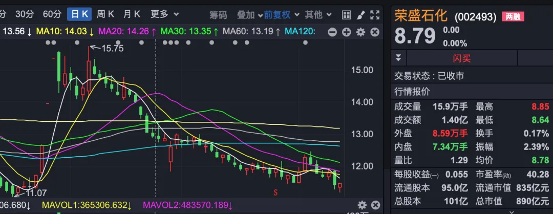 回看股价,2023年3月27日,荣盛石化大涨7.76%,3月28日、29日该股连续涨停,此后一度涨至15.66元/股的位置。