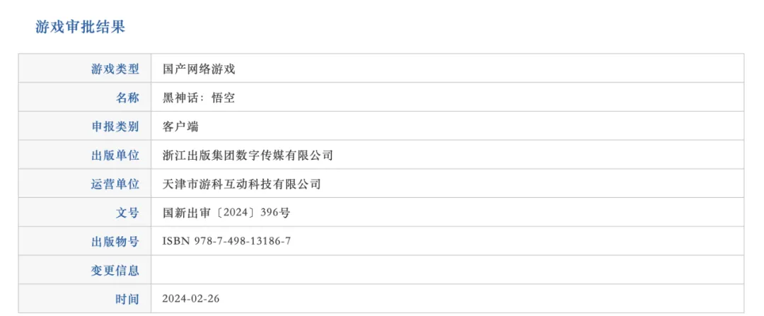 《黑神话》今年2月获得版号,其出版单位为浙江出版集团数字传媒有限公司。