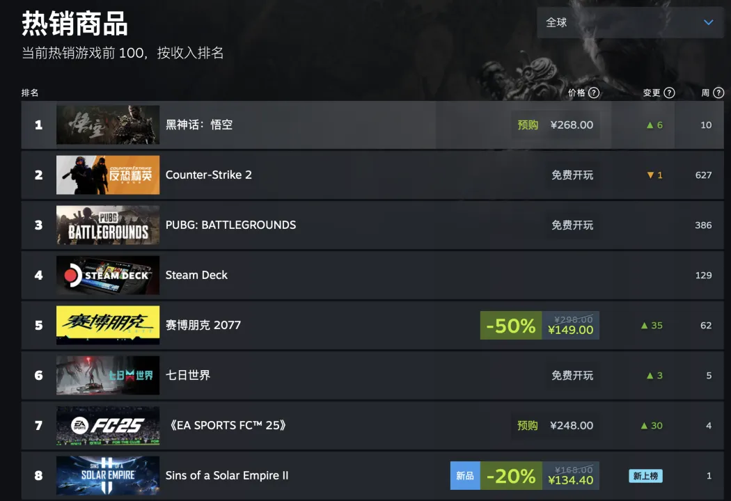 根据Steam官方公布的热销数据,《黑神话》在8月6日至8月13日的一周内,登顶该平台中国区销量第一,并已连续10周进入该榜单前100名,在全球销量排名第二。