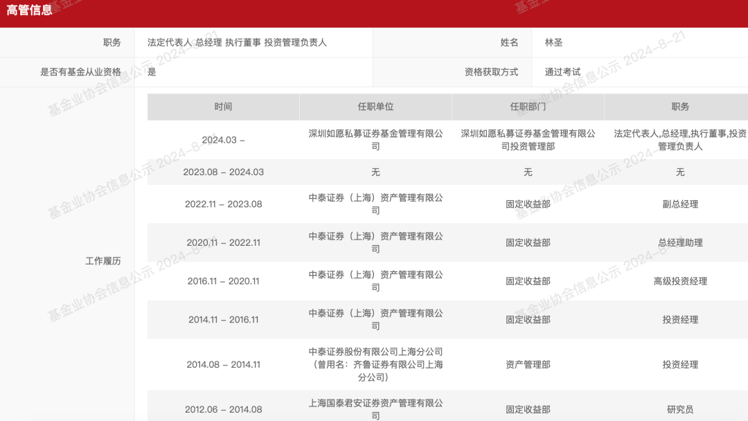 近期,中国证券投资基金业协会(以下简称协会)网站发布了一批刚刚完成备案登记的私募基金管理人名单。基金君留意到,其中有家新晋私募名叫“深圳如愿私募证券基金管理有限公司”(以下简称如愿私募基金),其实际控制人、总经理是中泰证券(上海)资产管理有限公司(以下简称中泰资管)固定收益部原副总经理林圣,他在固收领域做了十多年投研工作,如今选择“奔私募”创业,开启人生新征程。