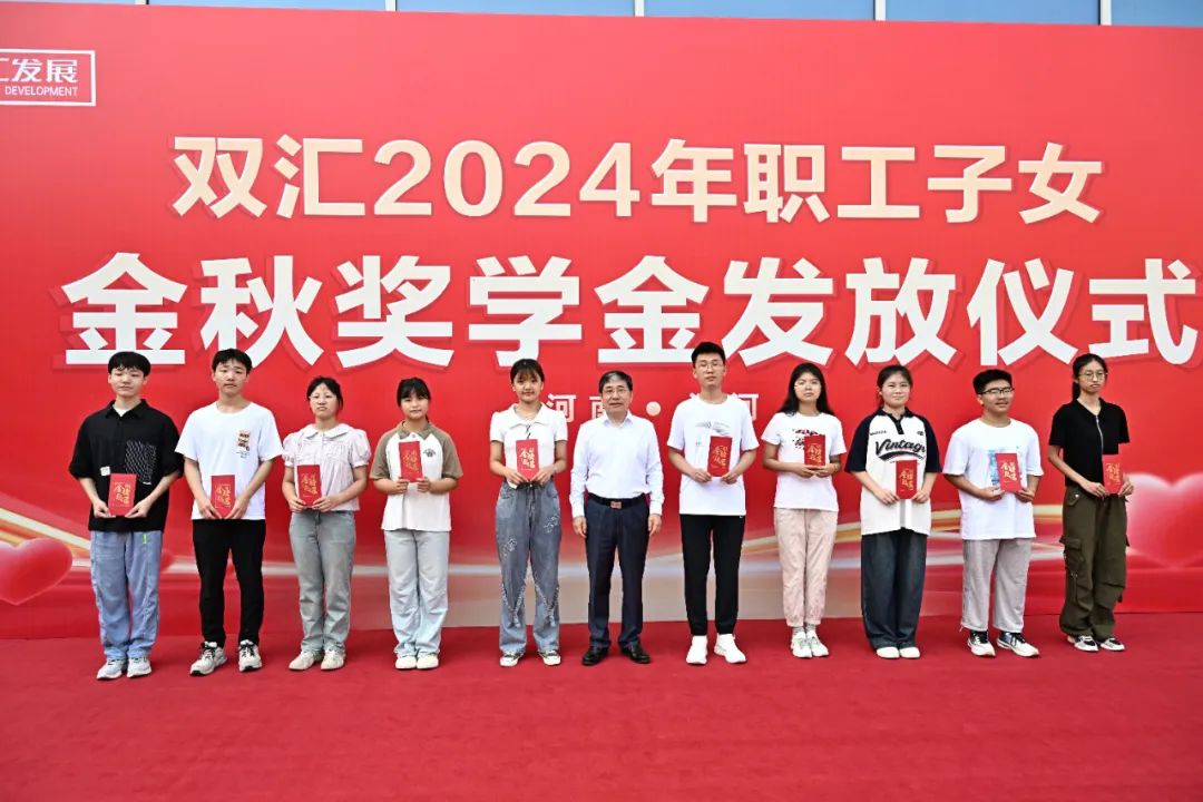 活动现场,双汇发展总裁马相杰,党委书记、工会主席杜俊甫,副总裁周霄为学生代表发放奖学金并合影留念。其他职工子女现场领取奖学金。