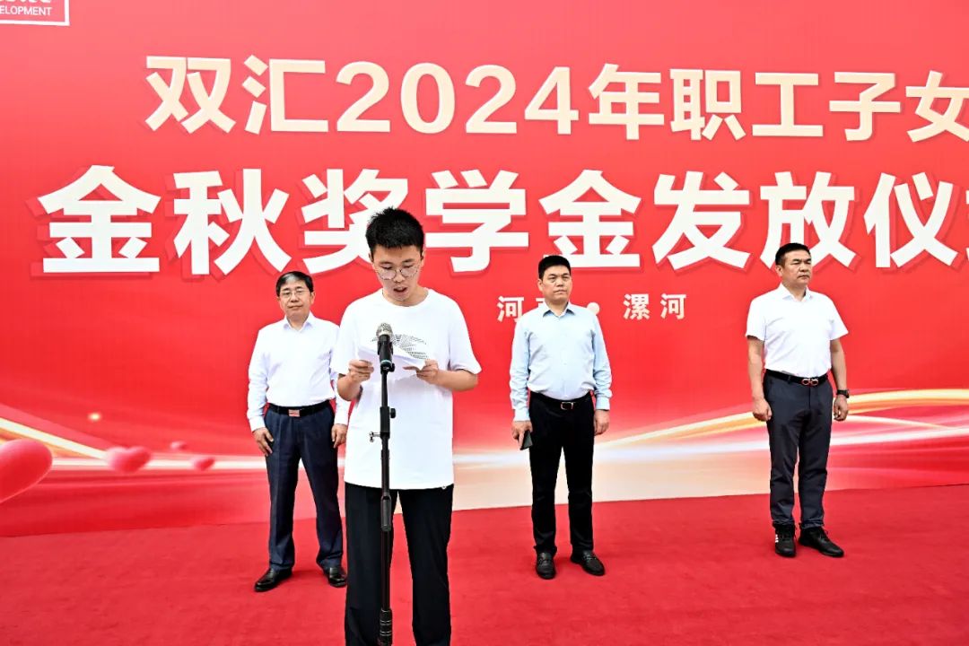 双汇职工代表薛志良上台发言,他表示,企业对职工子女的关心和支持,让大家深感暖心,也倍受激励,并号召大家继续发扬“优质、高效、拼搏、创新”的企业精神,为企业的伟大征程蓄力添彩。