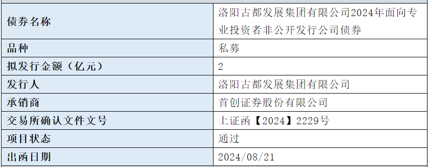 【大河财立方消息】8月23日,洛阳古都发展集团有限公司2024年面向专业投资者非公开发行公司债券项目,已获上交所通过。
