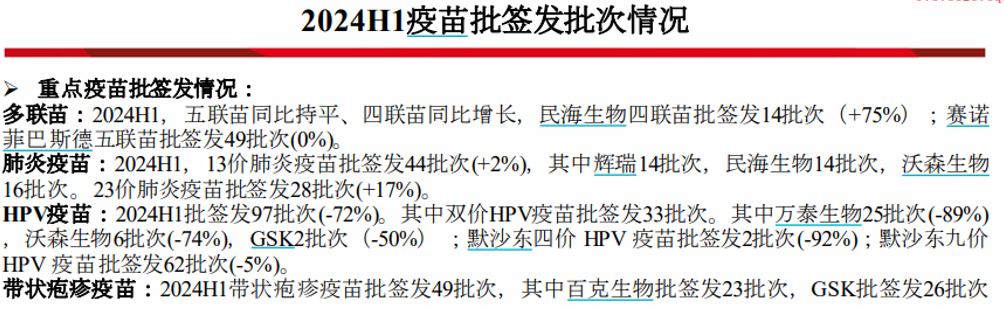 具体来看,上半年二价HPV疫苗批签发33批次,其中万泰生物25批次,同比减少89%;沃森生物6批次,同比减少74%;葛兰素史克2批次,同比减少50%。此外,默沙东四价HPV疫苗批签发2批次,同比减少92%;默沙东九价HPV疫苗批签发62批次,同比减少5%。