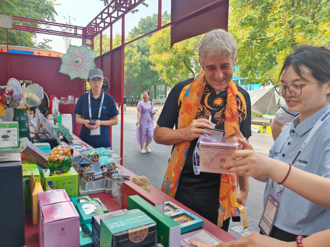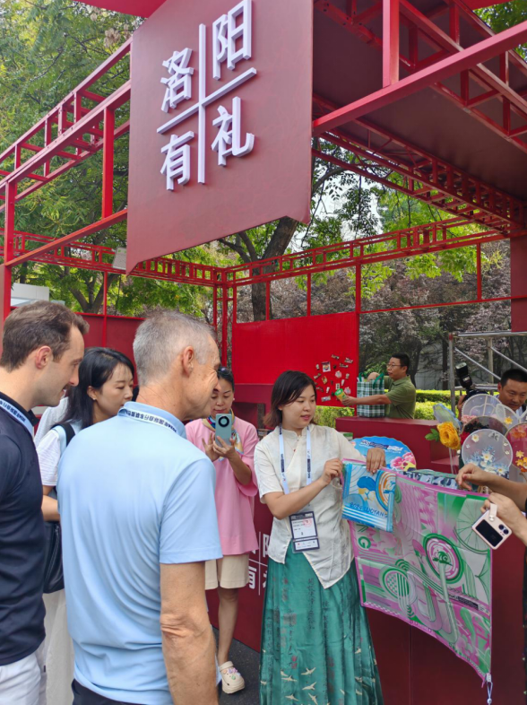 世青赛期间,为了助力洛阳文创产品“出海”,在世青赛场外举行了“集市·嘉年华”乐骑赛事特展。新式唐三彩、函关窑文创产品、宋氏面塑、洛阳特产白马寺牌酸奶、一朵牡丹花茶等一批具有地域特色的“洛阳礼物”纷纷参展。这些种类丰富的文创产品依托洛阳深厚历史文化、地域特色和现代旅游消费特点,深受世界青年的喜欢。