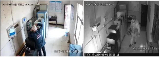 经调阅数据异常时段视频监控,执法人员发现该公司工作人员袁某某分别于2024年2月1日、2月6日、3月12日向废水自动监测设备水质采样器中倒入不明液体。