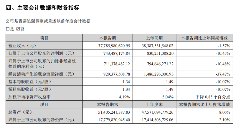 【大河财立方 记者 王鑫】8月28日晚,国药集团一致药业股份有限公司(以下简称国药一致)发布2024年半年报,该公司上半年实现营业收入377.86亿元,同比下降1.57%;归母净利润7.43亿元,同比下降10.45%;经营活动产生的现金流量净额为9.29亿元,同比下降37.47%。
