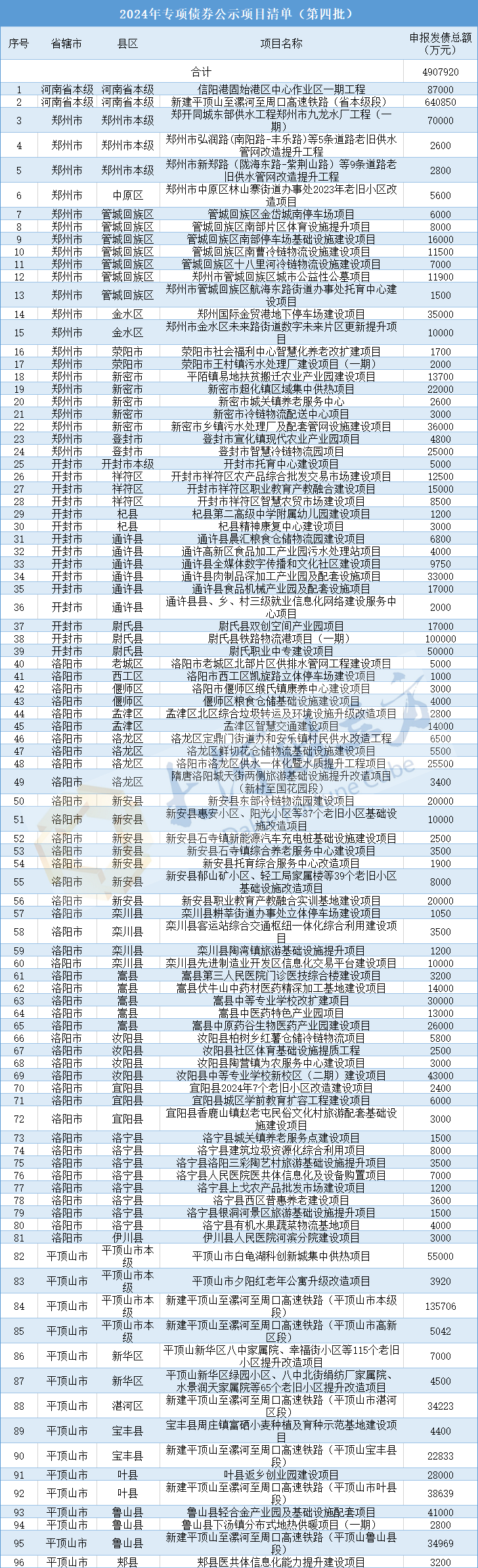 【大河财立方消息】大河财立方记者获悉,8月28日,河南省财政厅公示2024年第四批评审通过的专项债券项目(非拟发行项目)。本次公示涉及评审通过项目262个,申报发债总额490.79亿元。公示时间为2024年8月28日—2024年9月1日。