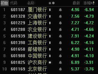 截至收盘,Wind银行股指数下跌3.27%。其中,工商银行股价下跌4.16%,农业银行股价下跌4.66%,中国银行股价下跌4.91%,建设银行股价下跌4.24%,交通银行股价下跌4.79%,邮储银行股价下跌4.11%。