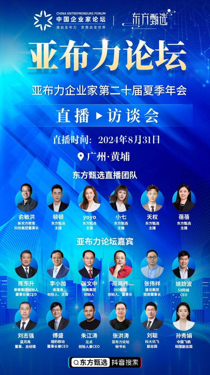 【大河财立方 记者 徐姣】2024亚布力企业家第二十届夏季年会将于8月31日在广州举办。作为亚布力中国企业家论坛轮值主席、东方甄选董事长及CEO,俞敏洪将带领东方甄选主播团队,在抖音“东方甄选”直播间对话12名企业家。