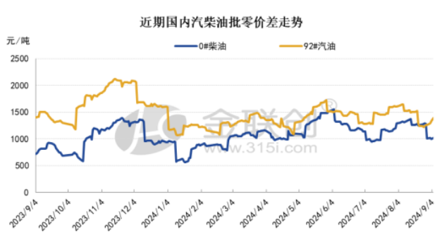 【大河财立方 记者 张克瑶】近期国内汽柴油批发行情接连下跌,而零售价保持稳定,故国内汽柴油批零价差持续拉宽。根据金联创监测数据,截至本周三(9月4日),我国汽油批零价差为1522元/吨,环比上涨145元/吨;柴油批零价差为1222元/吨;环比上涨118元/吨。