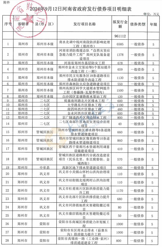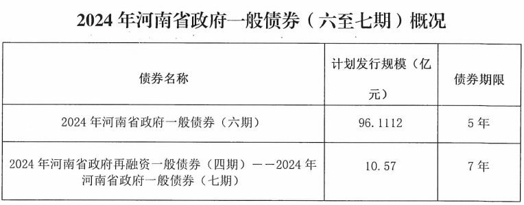 【大河财立方消息】9月5日,河南省财政厅披露2024年河南省政府一般债券(六至七期)信息文件。