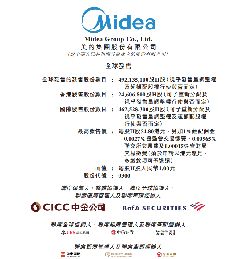 【大河财立方消息】9月9日,美的集团公告宣布全球发售计划,将于2024年9月9日~9月12日招股,拟全球发售4.92亿股H股,预期H股将于9月17日上市。