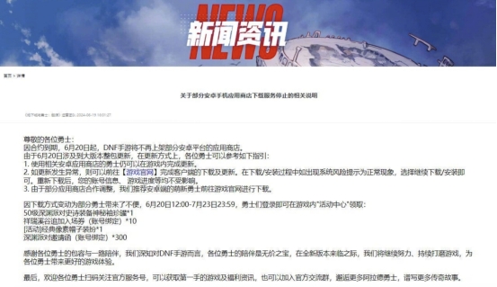 2024年6月,腾讯热门手游《DNF》上架仅一个月,就宣布不再上架部分安卓平台的应用商店,玩家可选择在官网下载安装包,还能得到额外赠送的游戏道具。