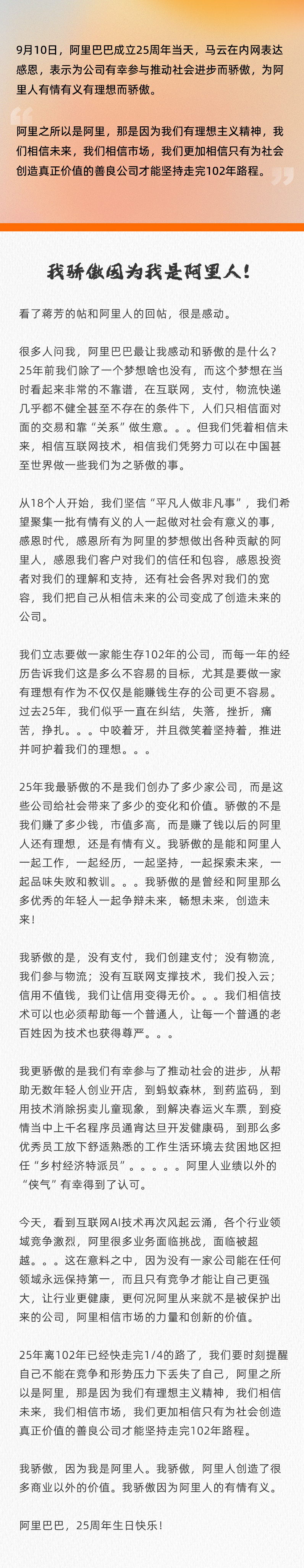 9月10日是阿里巴巴成立25周年,马云在阿里巴巴内网发帖鼓励阿里人:“阿里之所以是阿里,那是因为我们有理想主义精神,我们相信未来,我们相信市场,我们更加相信只有为社会创造真正价值的善良公司才能坚持走完102年路程。”