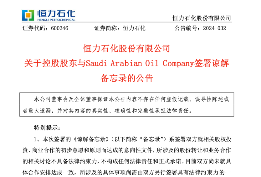 今年4月,恒力石化公告称,控股股东恒力集团与沙特阿美签署《谅解备忘录》,双方正在讨论沙特阿美拟向恒力集团收购其所持有的占公司已发行股本百分之十加一股的股份。