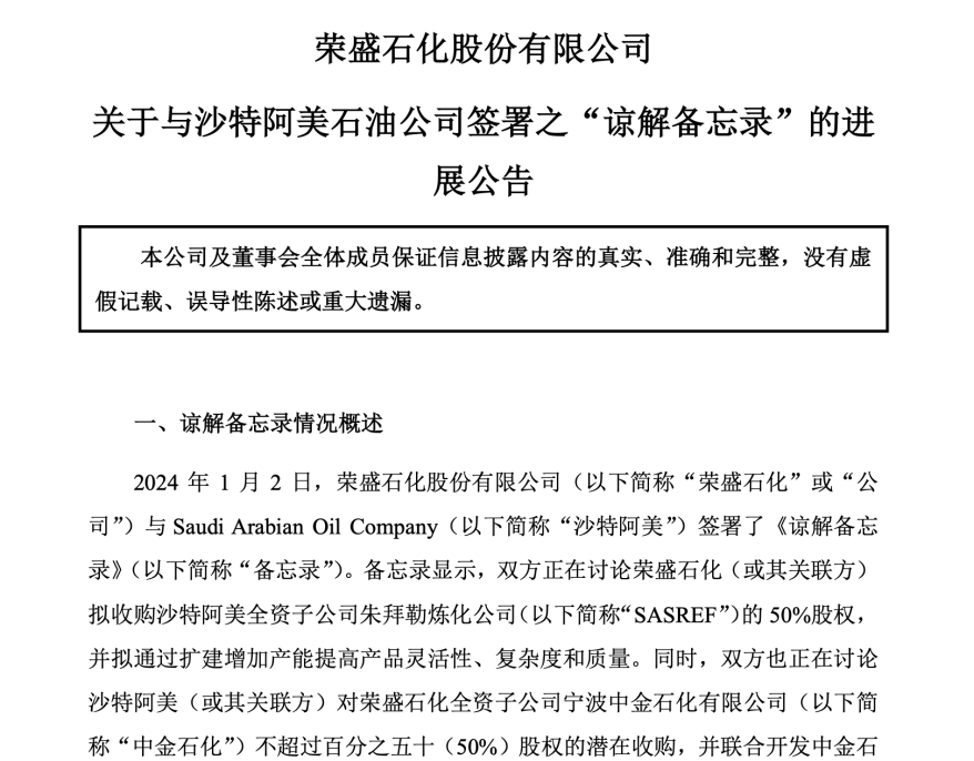 同时,双方也正在讨论沙特阿美(或其关联方)对荣盛石化全资子公司中金石化不超过50%股权的潜在收购,并联合开发中金石化现有装置升级扩建。