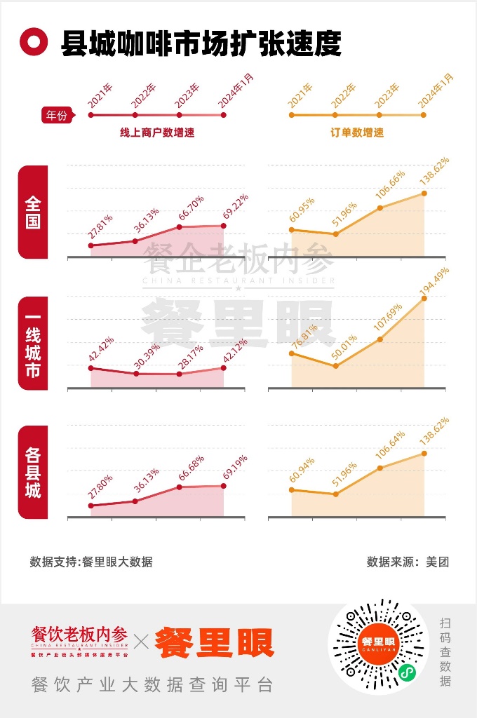 根据GeoQ Data 品牌数据,各咖啡品牌在县域市场的门店总数约5454家,其中2023年新开门店3700家左右。根据美团数据,县域市场的线上咖啡增速从2021年的27.8%飙升至2024年的69.19%,线上订单也保持了三年高速增长。
