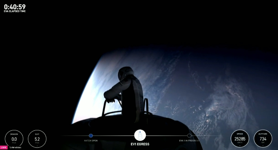 该任务由现年41岁的美国亿万富翁艾萨克曼和该公司一工程师出舱进行。通过“天行者”(Skywalker)梯子,以及12英尺长的系绳,艾萨克曼率先走出太空舱,并在舱外待了10多分钟。随后,吉利斯出仓,同样在舱外待了10多分钟,以测试SpaceX宇航服的性能。