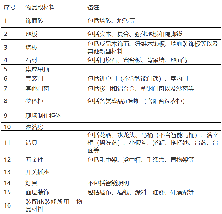 物品和材料包括:饰面砖、地板、墙板、集成吊顶、套装门、整体柜、淋浴房、洁具等(具体品类详见附件1),补贴品类应向先进、绿色、低碳、环保产品倾斜,同一套房不可同时享受商务部门组织的家居消费品换新和民政部门的居家适老化改造相关补贴政策。