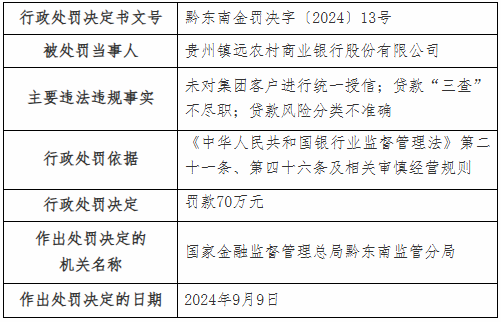 【大河财立方消息】9月13日消息,贵州镇远农村商业银行股份有限公司因未对集团客户进行统一授信;贷款“三查”不尽职;贷款风险分类不准确,日前被国家金融监督管理总局黔东南监管分局处罚款70万元。