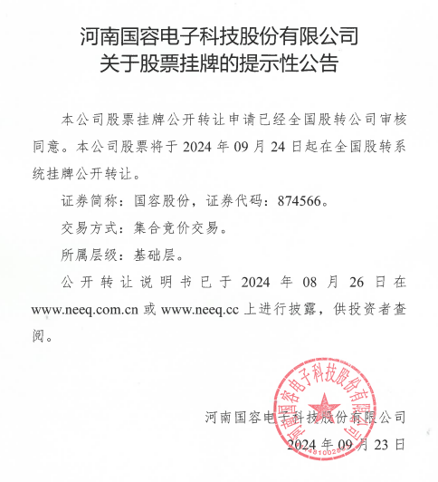 9月23日,河南国容电子科技股份有限公司(以下简称国容股份)发布公告称,该公司股票挂牌公开转让申请已获全国股转公司审核同意,公司股票将于9月24日起在全国股转系统挂牌公开转让。