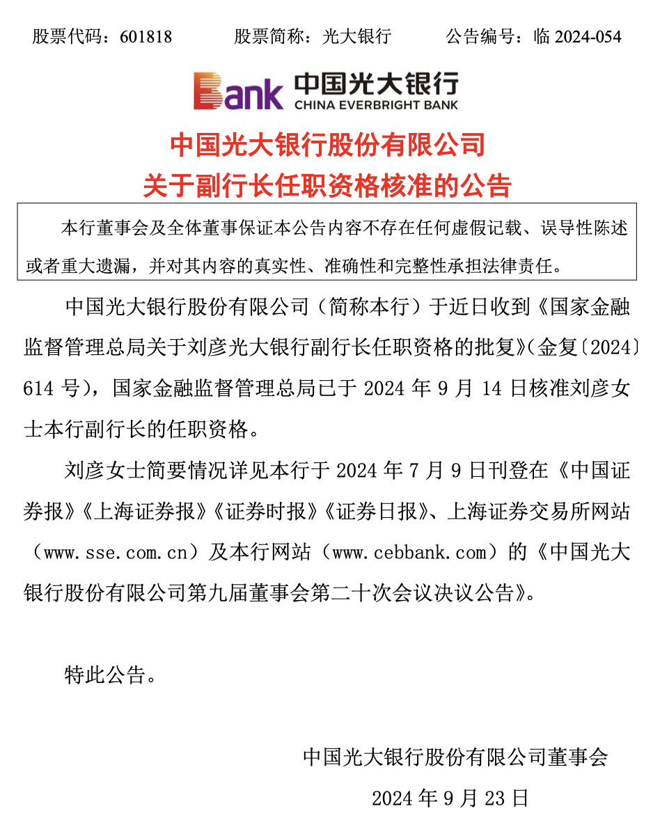 【大河财立方消息】9月23日,光大银行发公告称,刘彦已任该行副行长。
