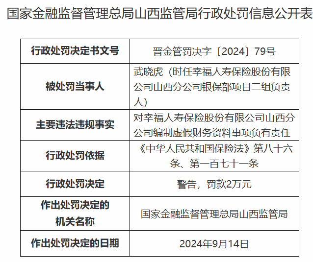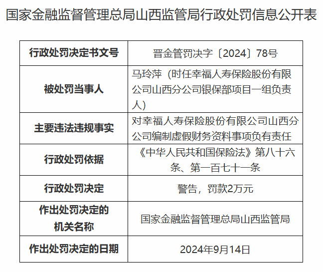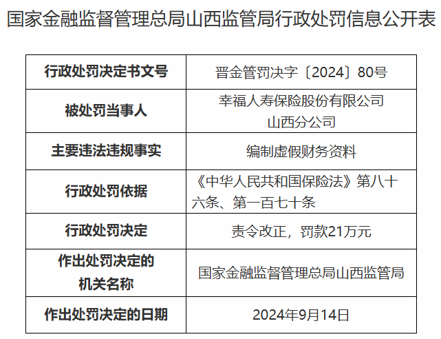 【大河财立方消息】9月25日,国家金融监督管理总局山西监管局披露的行政处罚信息公开表显示,幸福人寿保险股份有限公司山西分公司因编制虚假财务资料,被监管责令改正,并处以罚款21万元。