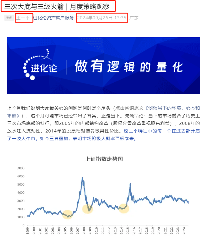 进化论资产在今天中午股市开启暴涨之时即发文,标题是《三次大底与三级火箭》,署名为公司创始人、首席投资官王一平。